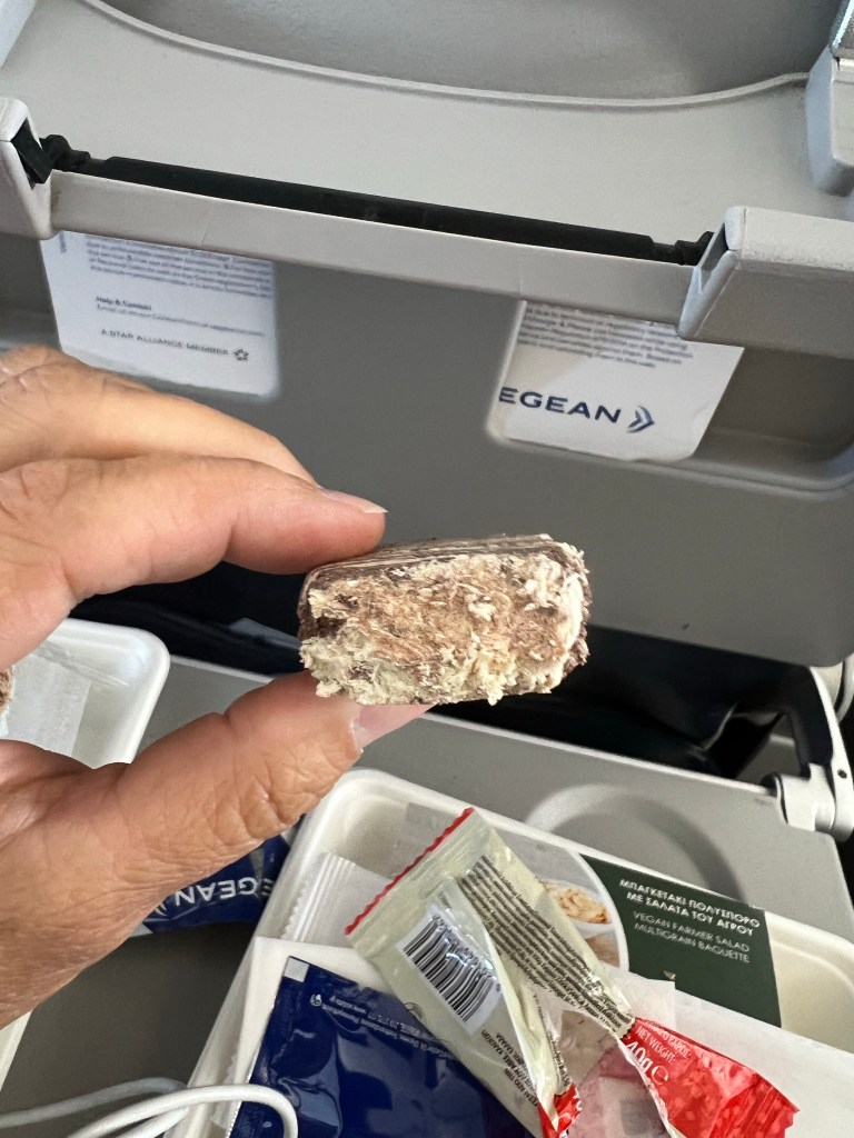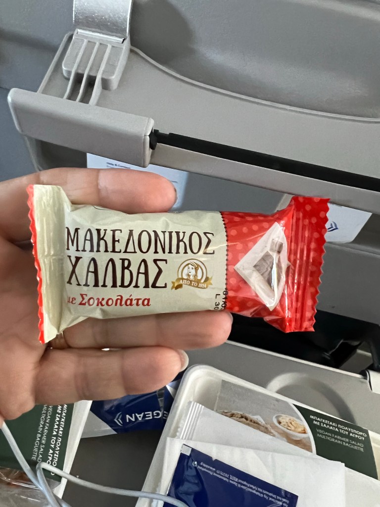 Interesting lunch on our flight. A vegan sandwich made with carrot, celery, corn and rockets with a slight sauce. It was like Joey Tribianni eating beef in his trifle. Corn good. Carrots good. Celery good. Rockets good. Just a little odd having it all together on a sandwich. Then dessert was a little bar made with sesame and sugar. All the writing on the packages was in Greek so we needed to ask for explanations from the stewards.