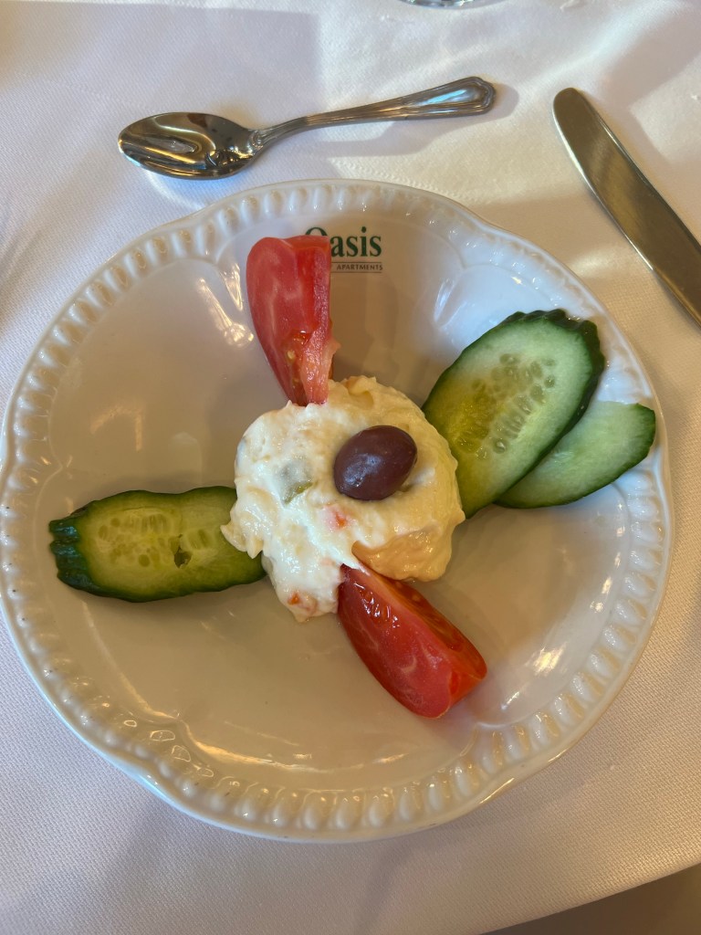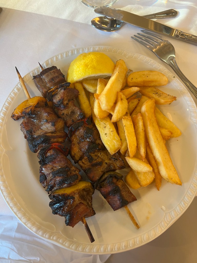 Lane asked for a pic for his mom ❤️I took a pic of Bridget taking a pic of the sunset and others. Souvlaki and fries SaladOlives at city centerSome dessert made from sesame. The dessert package.